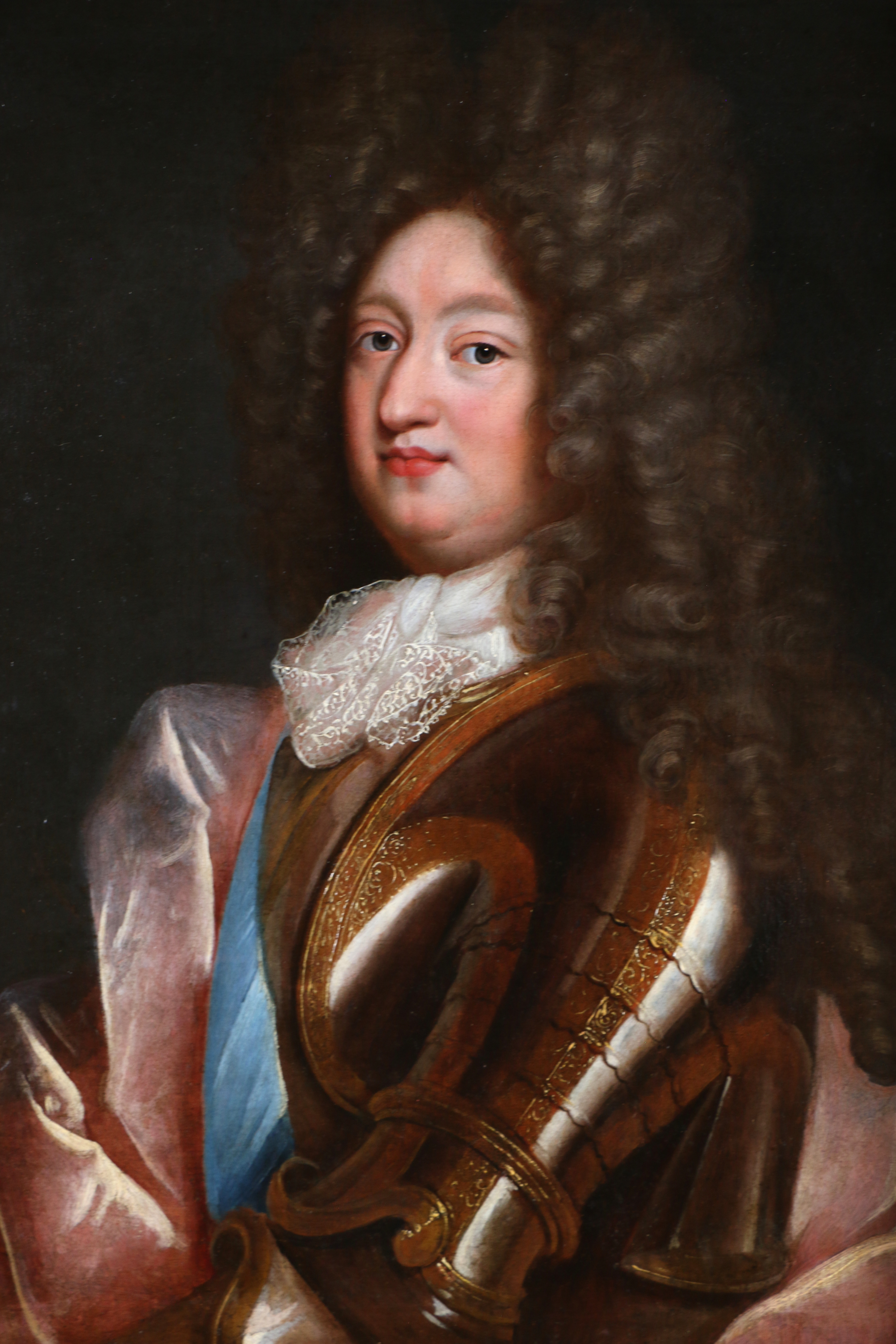 Le Grand Dauphin, fils aîné de Louis XIV et de Marie-Thérèse d’Autriche, est ici superbement représenté en buste, vêtu d’une armure damasquinée, le ruban bleu du Saint-Esprit en travers de la poitrine, sur fond sombre.