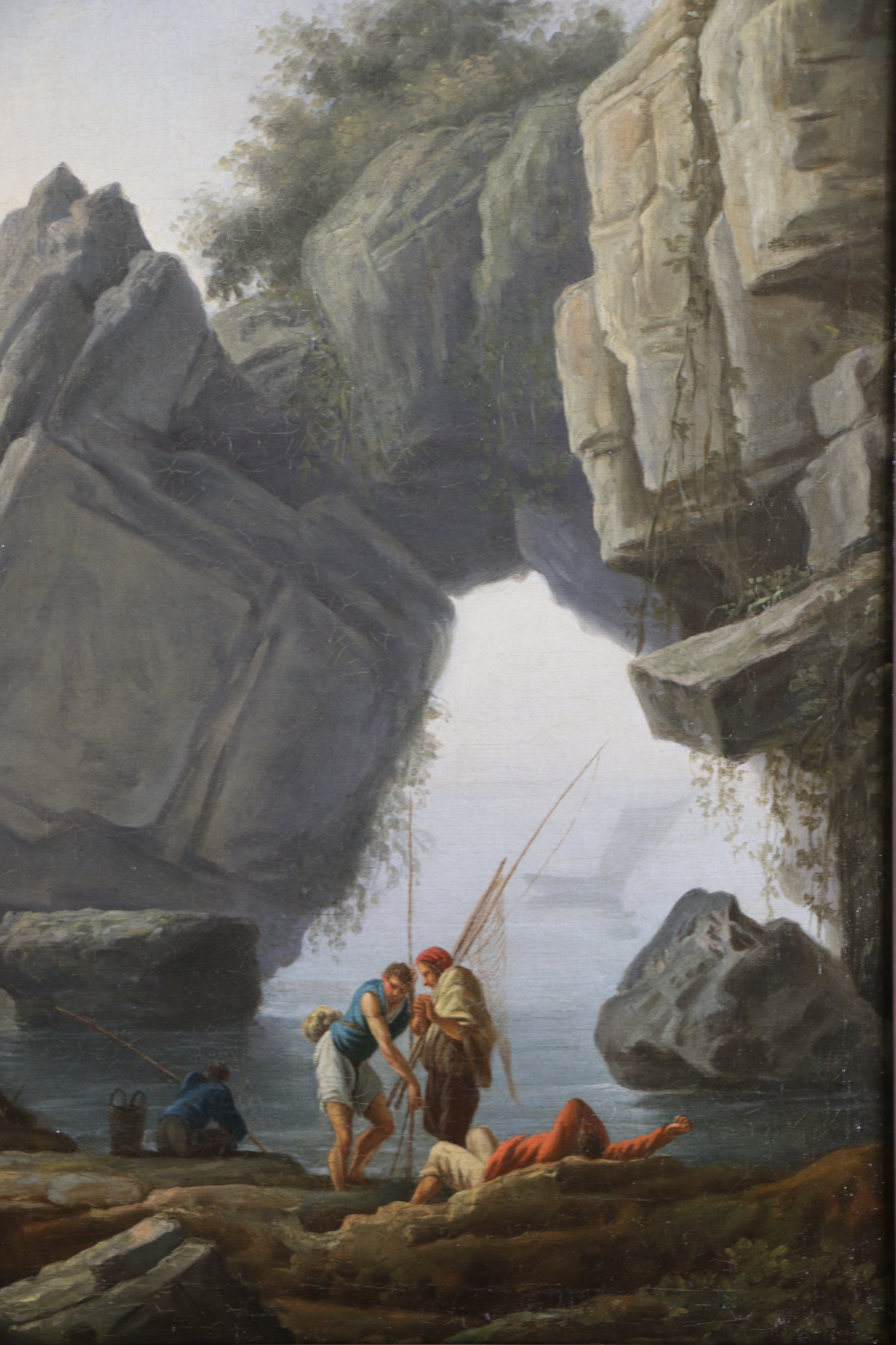 La scène représente un paysage côtier animé par un groupe de pêcheurs, dominé par une imposante arche rocheuse qui structure la composition. Cette masse minérale, traitée par larges plans et subtiles variations de tons, confère au tableau une forte présence visuelle tout en laissant respirer l’ensemble. Le paysage n’est pas un simple décor : il constitue l’ossature même de la scène.