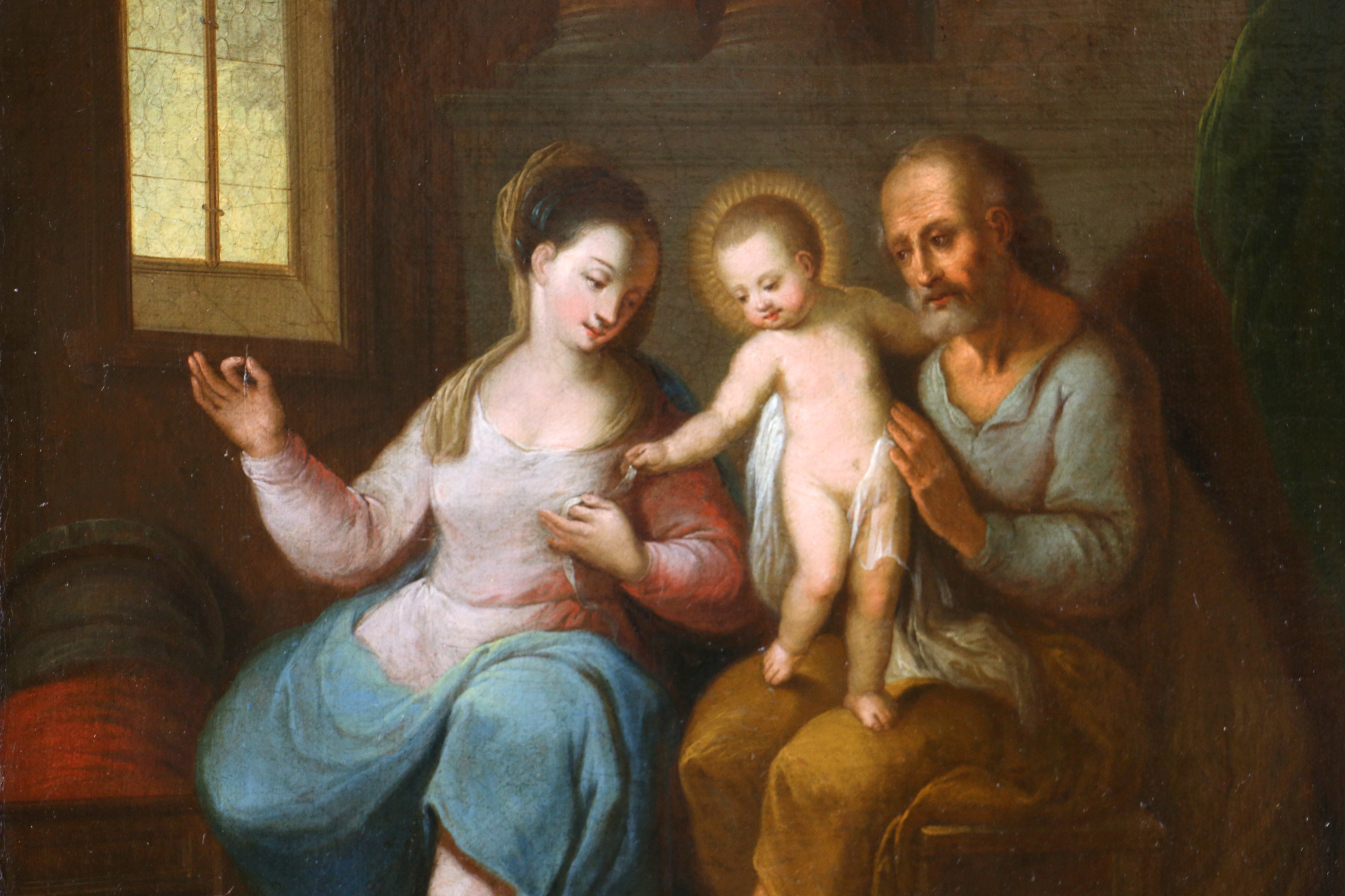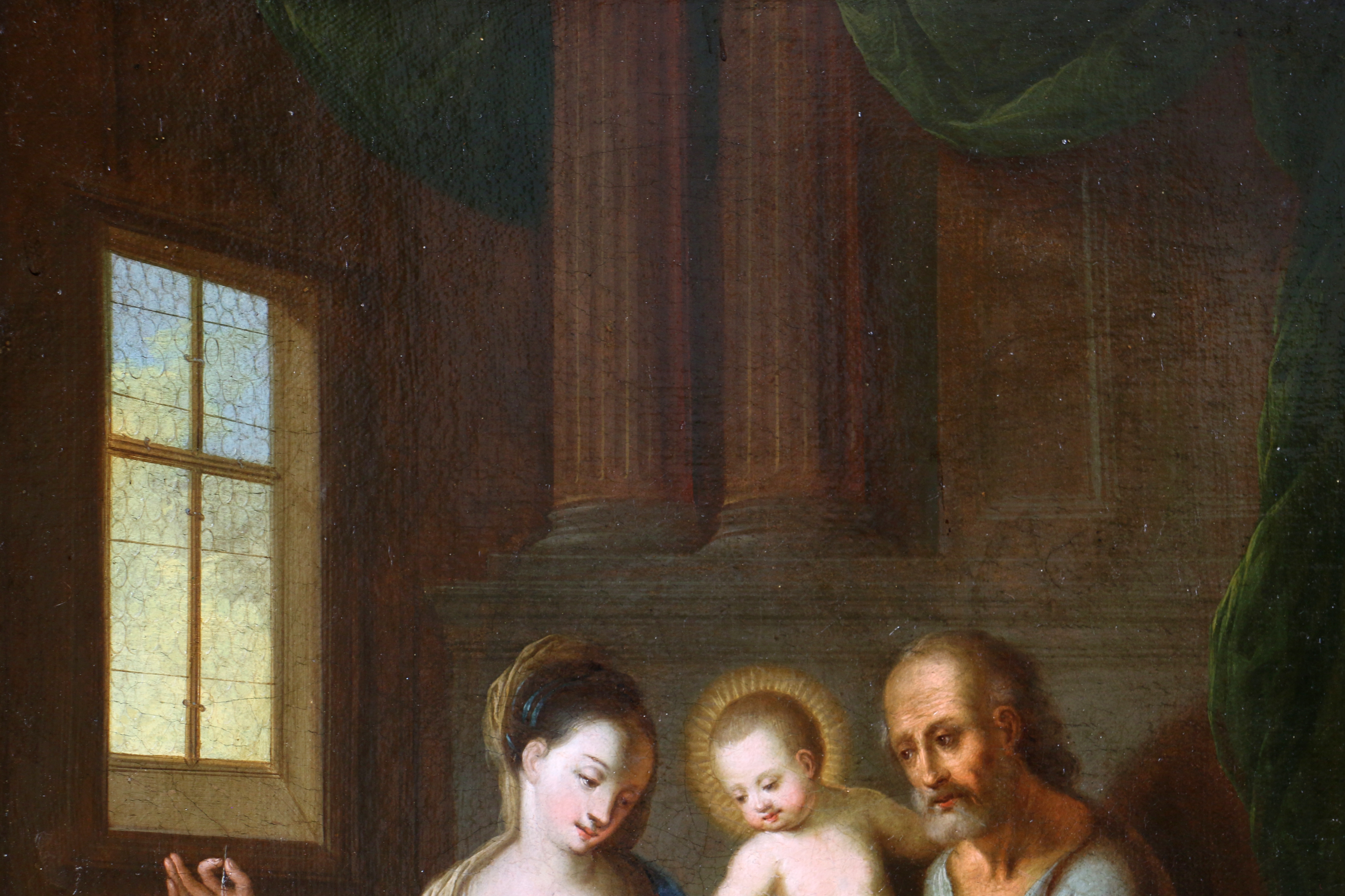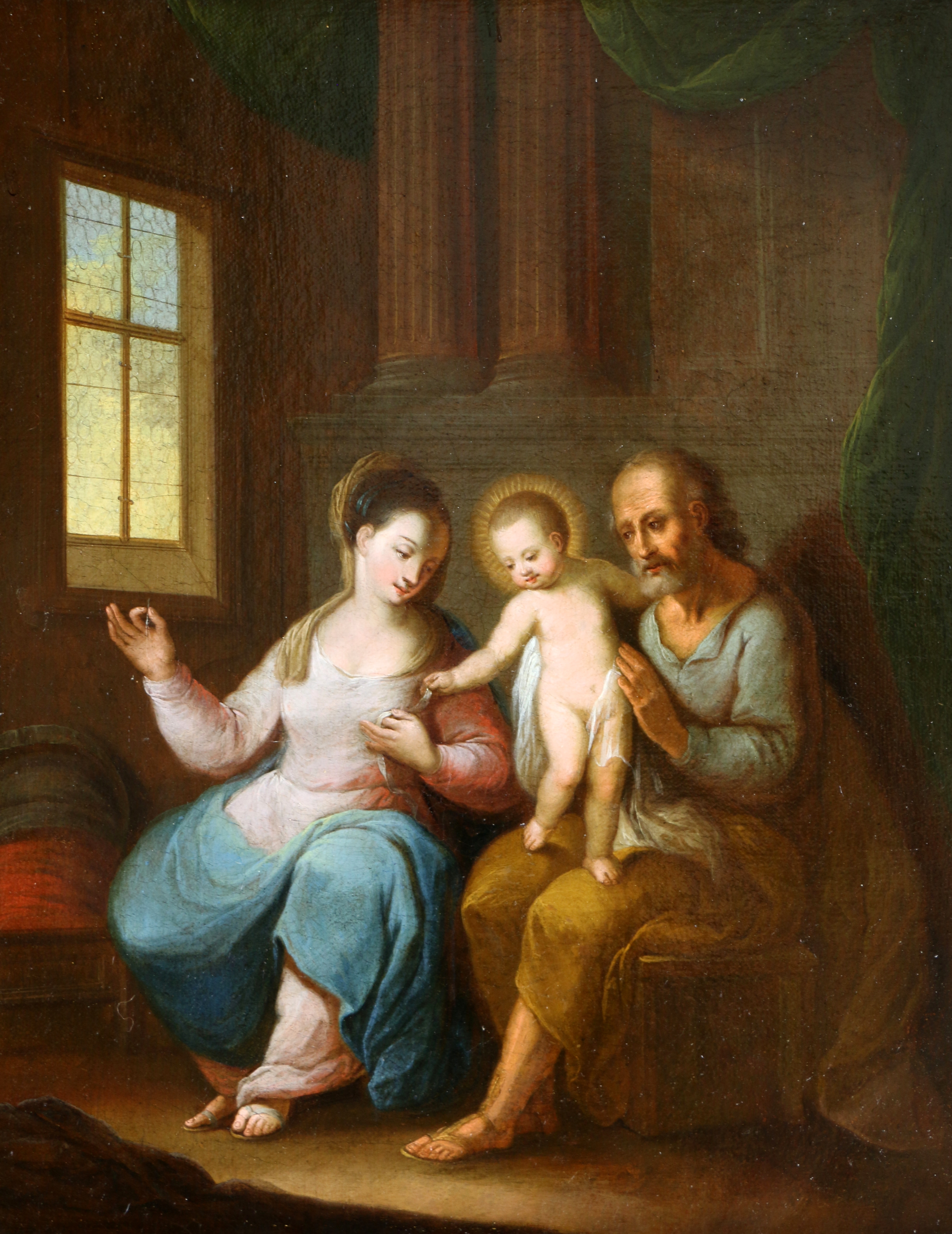 Ecole du nord de l’Italie vers 1650/70. La Sainte Famille dans un intérieur.