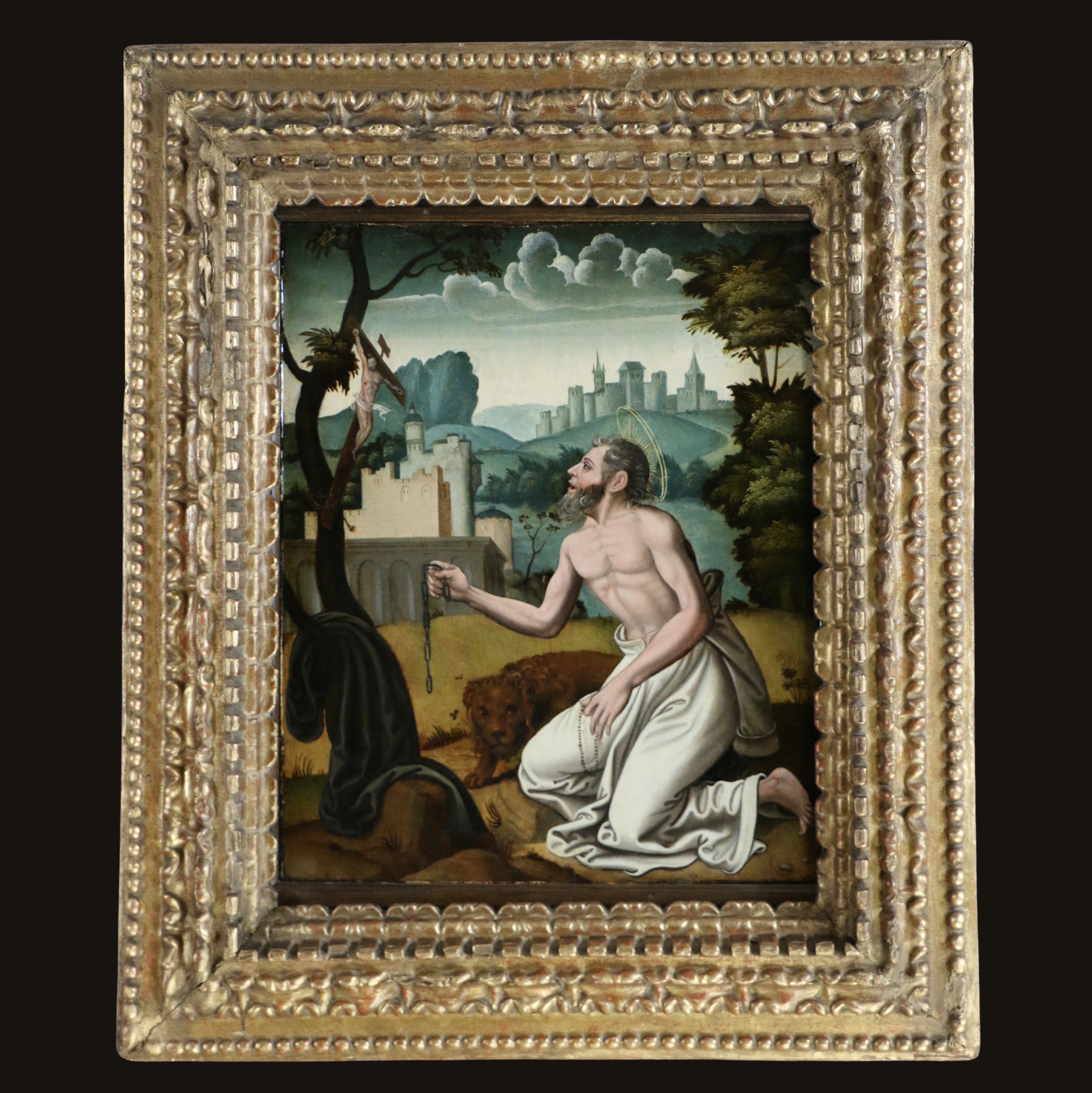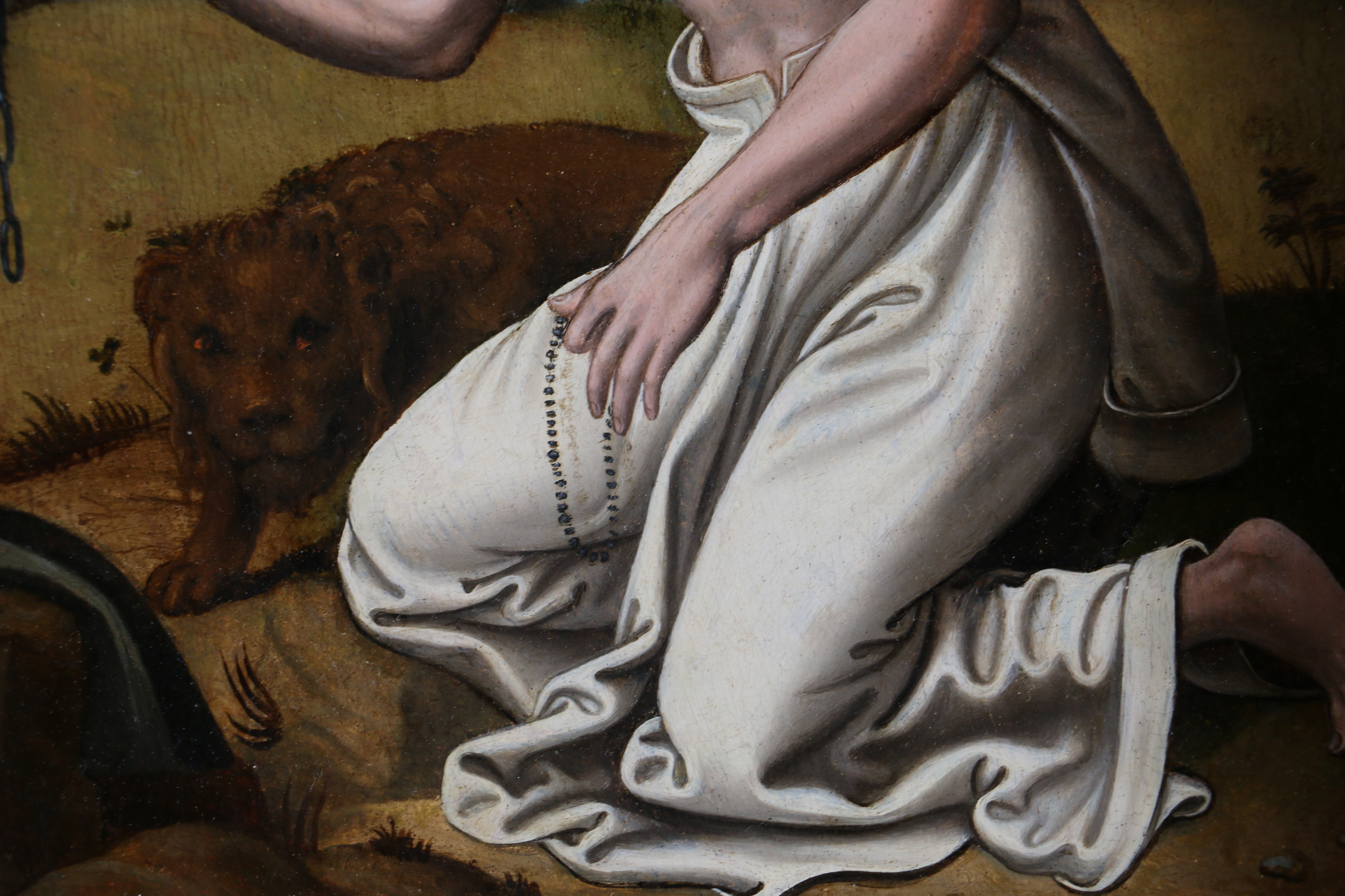 Ce très intéressant tableau, considéré auparavant comme une école vénitienne du XVI è siècle est en fait attribuable à un peintre français qui certes s’est beaucoup inspiré de la peinture italienne, Simon de Châlons (1500-1561). Hormis des critères généraux, ce sont surtout des points précis qui suggèrent et appuient cette attribution, car retrouvés dans d’autres œuvres du peintre. C’est notamment le cas du magnifique rendu des tissus de la tunique de saint Jérôme, des paysages avec la façon de rendre les végétaux et les bâtiments et enfin, de manière assez surprenante de ce visage de Saint Jérôme qui est repris dans un autre tableau pour la représentation d’un autre personnage. A noter cependant quelques différences stylistiques notamment dans les nuages et de manière générale avec un trait un peu plus raide, ce qui nous suggère l’atelier du peintre.