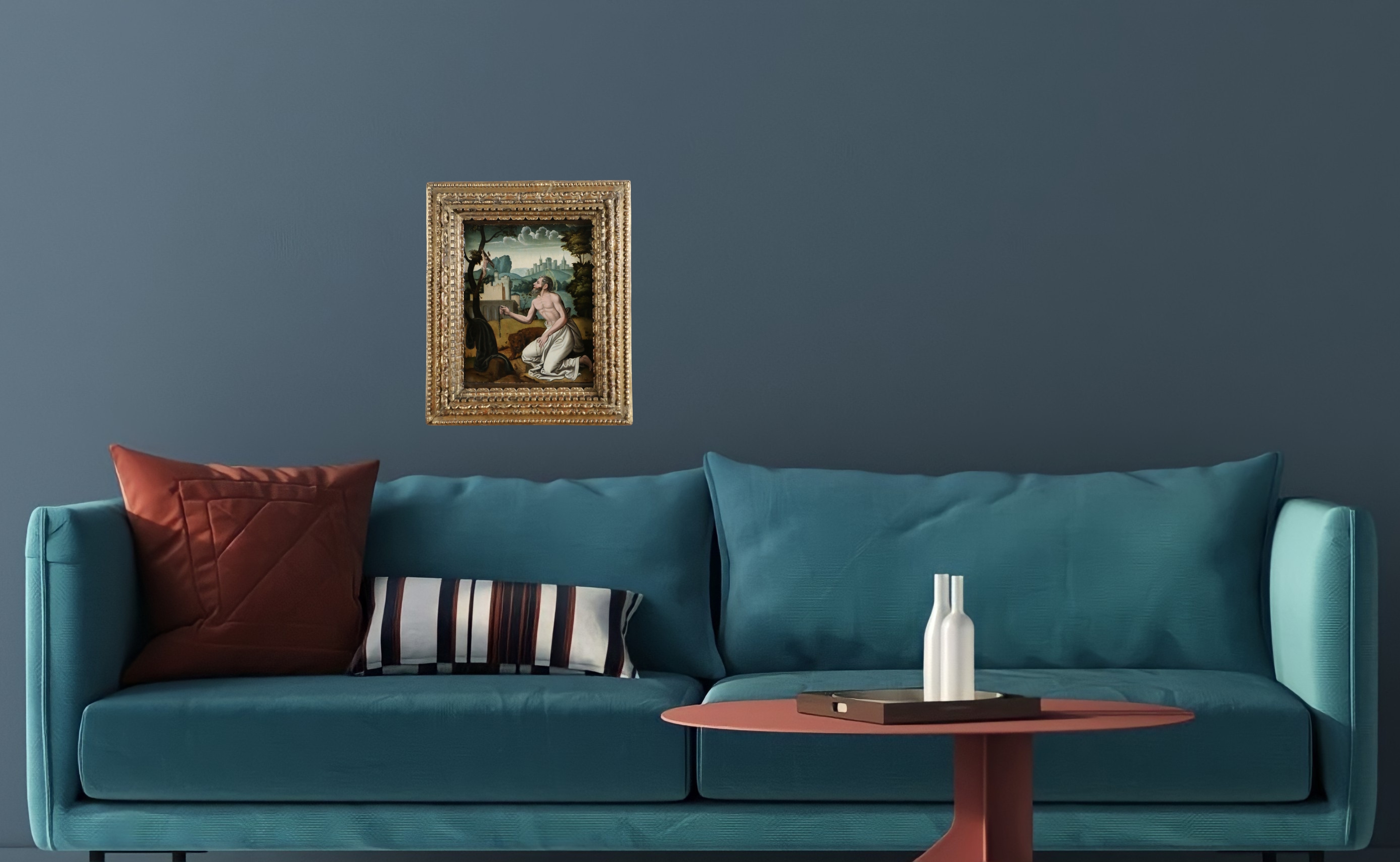 L’artiste s’est inspiré tout à fait librement deux autres représentations de Saint Jérôme où on voit saint Jérôme sur la droite regardant vers la gauche le Christ sur la croix, un Christ représenté en chair et en os (et pas une simple croix ou un crucifix sculpté comme souvent), l’une de Pietro Perugino (1445-1523) et l’autre de Giovanni Battista Cima (1459-1517).