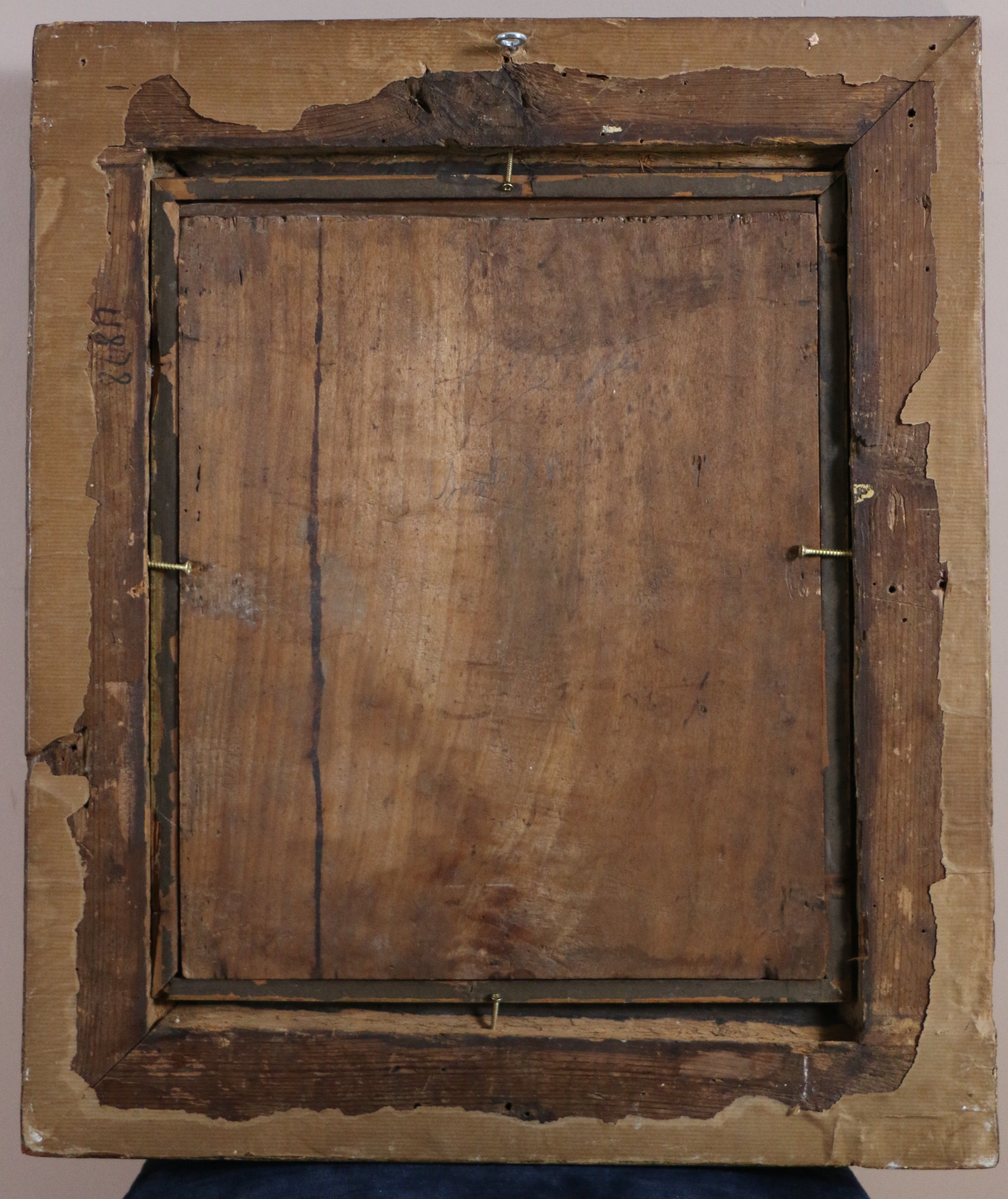 La qualité de l’œuvre passe également par le soin apporté au support choisi. Nous avons ici une huile sur un panneau entier de qualité fin (3 à 4 mm) qui est contrecollé sur un panneau de tilleul (ou de fruitier). Nous n’oublions pas bien entendu ce beau cadre ancien.