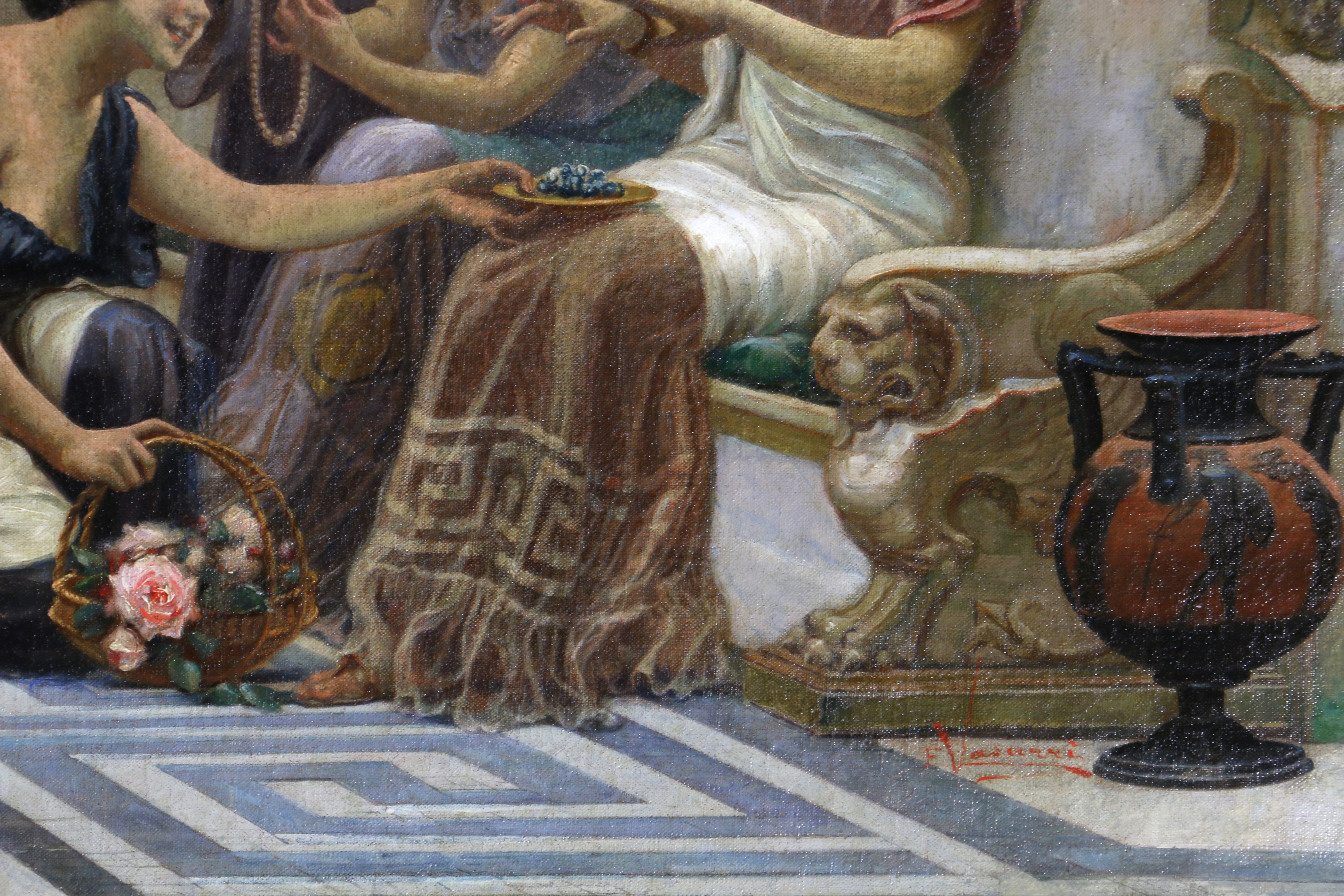 Cette toile est à rapprocher d'une oeuvre sur le même thème (« the ladies of Pompeii ») vendue par Sotheby's New York en 1991, 35000 dollars, une autre œuvre de cette série (la fête des fontaines) a atteint 120000 frais compris toujours chez Sotheby's en 1996. Le tableau est signé en bas à droite.