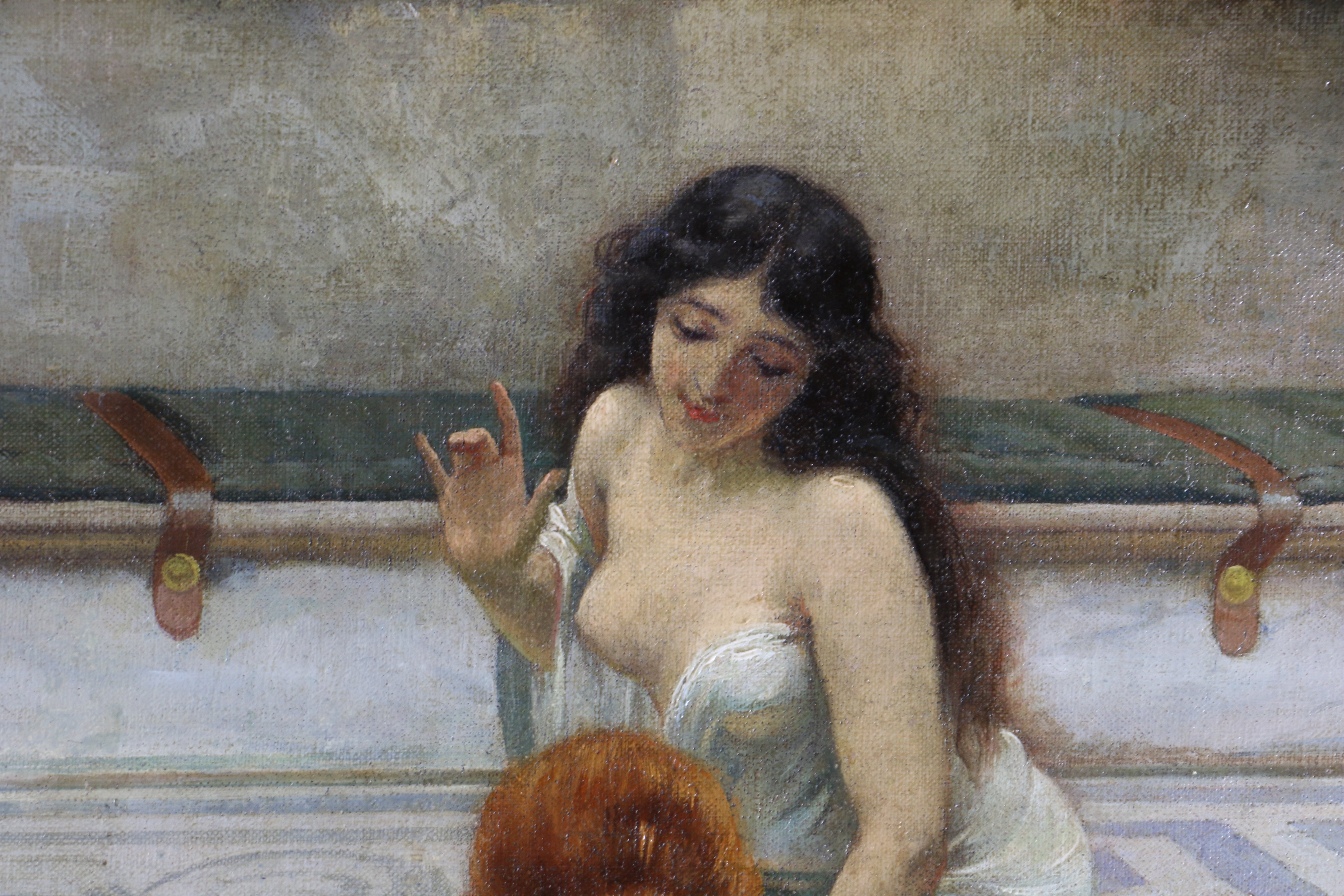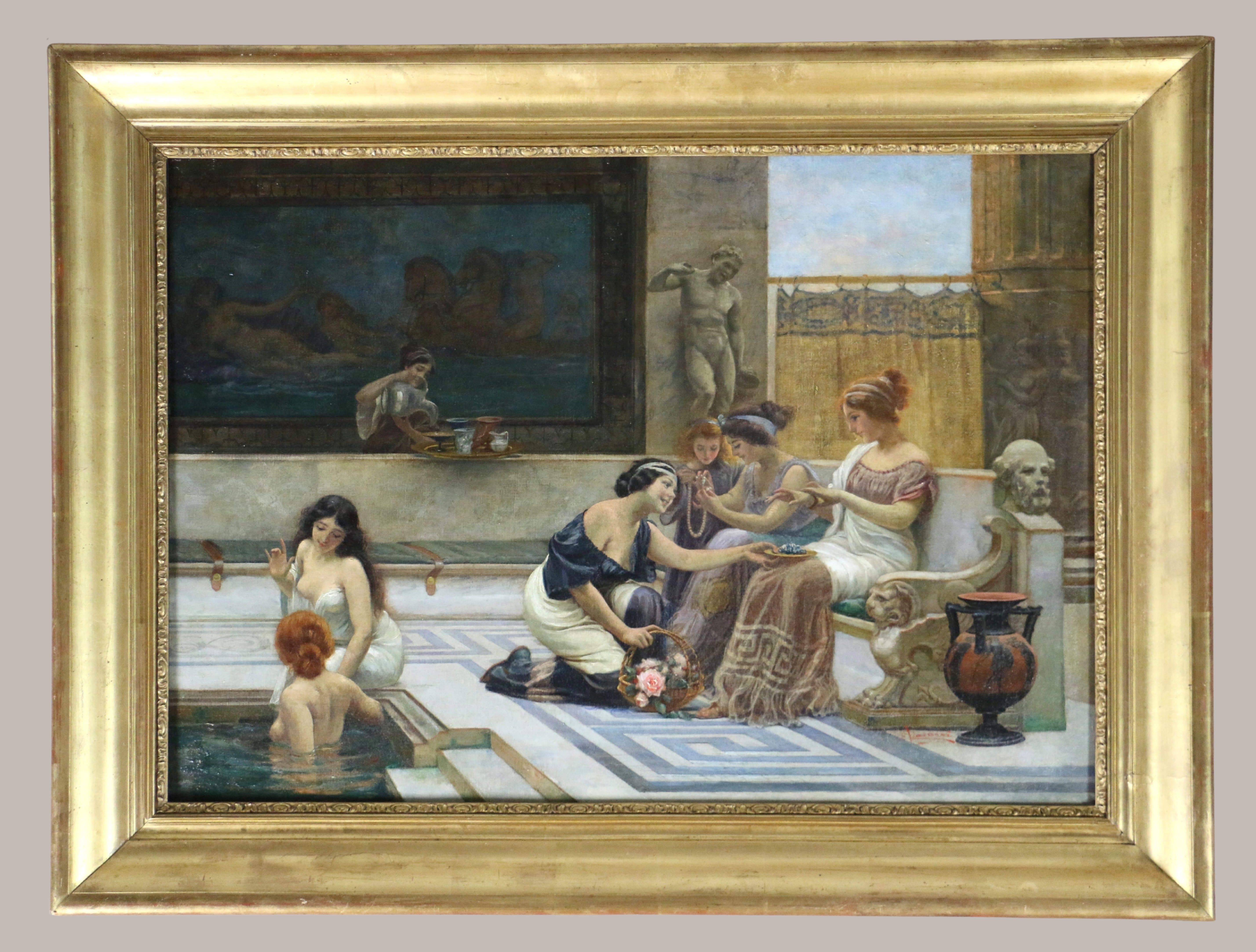 Notre tableau représente une scène thermale dans l’Antiquité, probablement dans un bain public ou une maison romaine.L’ensemble est baigné d’une lumière douce et chaude, évoquant un moment paisible et intime.Au premier plan, plusieurs femmes sont rassemblées dans un cadre architectural raffiné. À gauche, deux femmes se baignent dans un bassin ; leurs gestes sont gracieux et naturels, traduisant une atmosphère de détente. L’eau reflète légèrement leurs silhouettes et la lumière ambiante.Au centre, une femme agenouillée, vêtue d’une robe bleu nuit, tend des fleurs à une autre assise sur un siège décoré de motifs sculptés. Autour d’elles, deux autres femmes participent à la scène, l’une observant, l’autre manipulant un collier.L’arrière-plan présente des éléments architecturaux classiques : colonnes, statue masculine, frise décorative et tenture dorée filtrant la lumière du jour. On distingue également une fresque murale représentant des figures mythologiques ou aquatiques, ajoutant une dimension culturelle et esthétique à la composition.Les couleurs dominantes sont douces et harmonieuses : des tons chair, ivoire, or, bleu pâle et brun chaud.