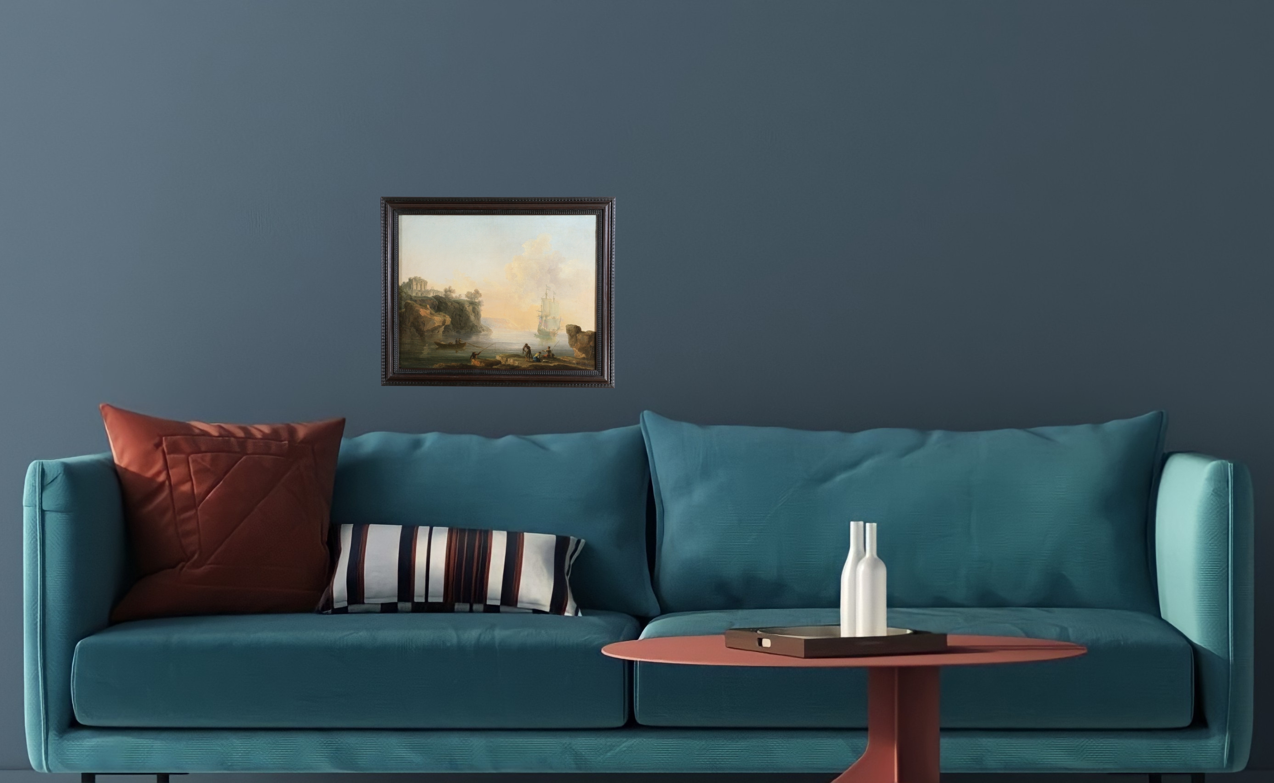 À droite, un grand trois-mâts aux voiles partiellement carguées s’élève dans une brume lumineuse. Son gréement se découpe délicatement sur l’atmosphère chaude de l’horizon. L’ensemble est construit selon un équilibre classique : masse sombre à gauche, ouverture lumineuse à droite, profondeur suggérée par un lointain légèrement estompé.