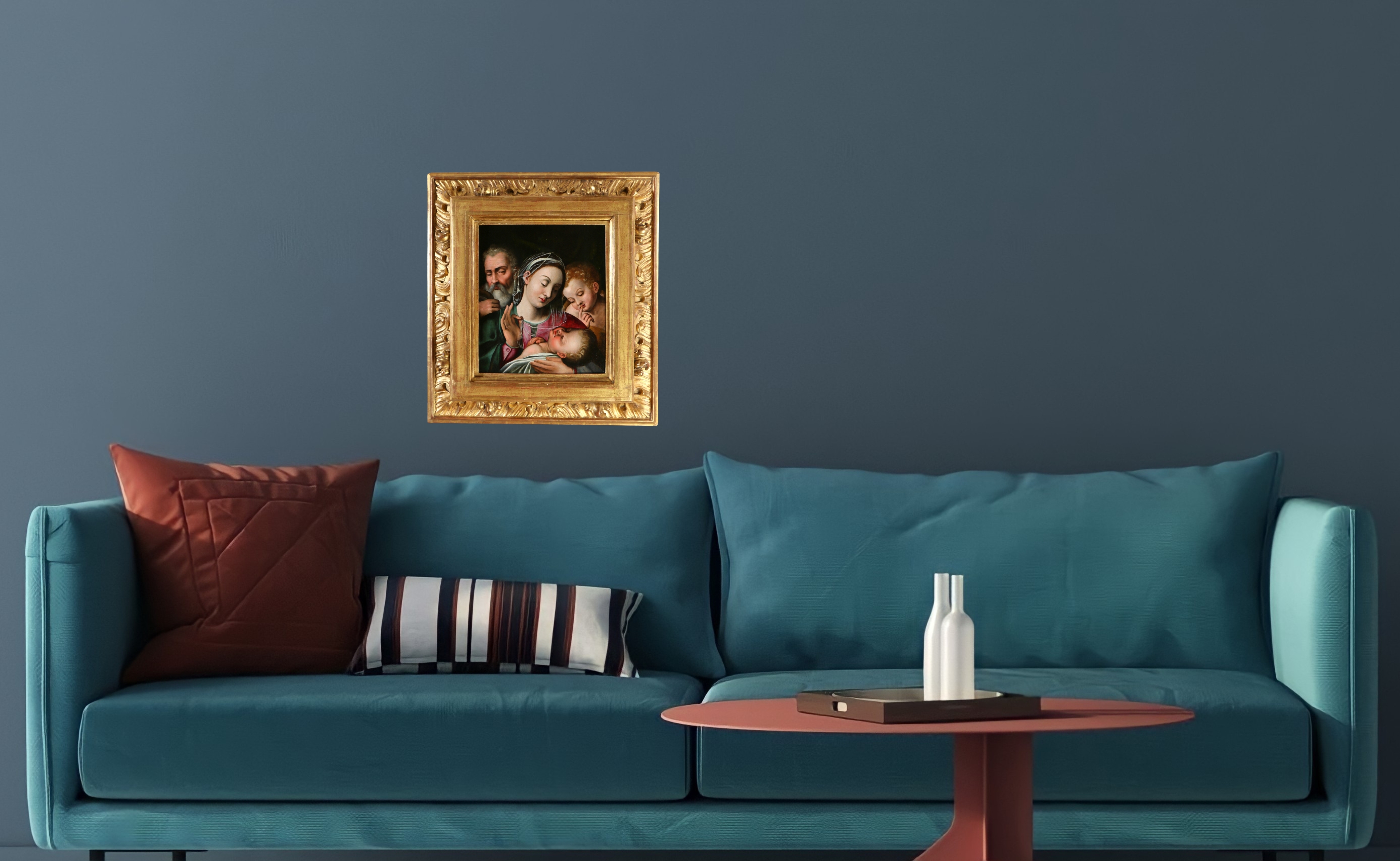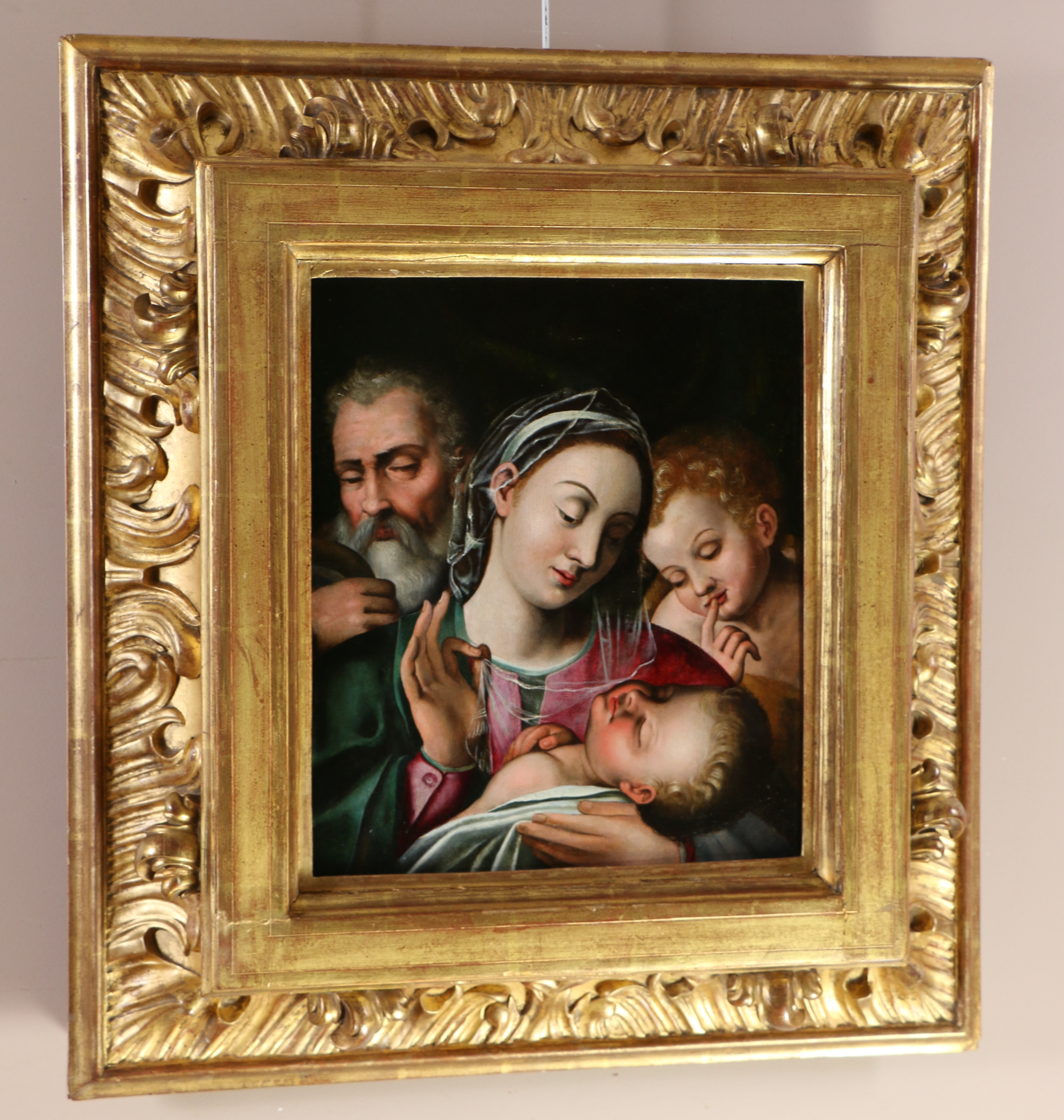 Ce superbe tableau magnifié par un somptueux cadre, nous propose une Sainte Famille avec le jeune saint Jean-Baptiste, thème particulièrement répandu dans la peinture italienne de la première moitié du XVIe siècle.