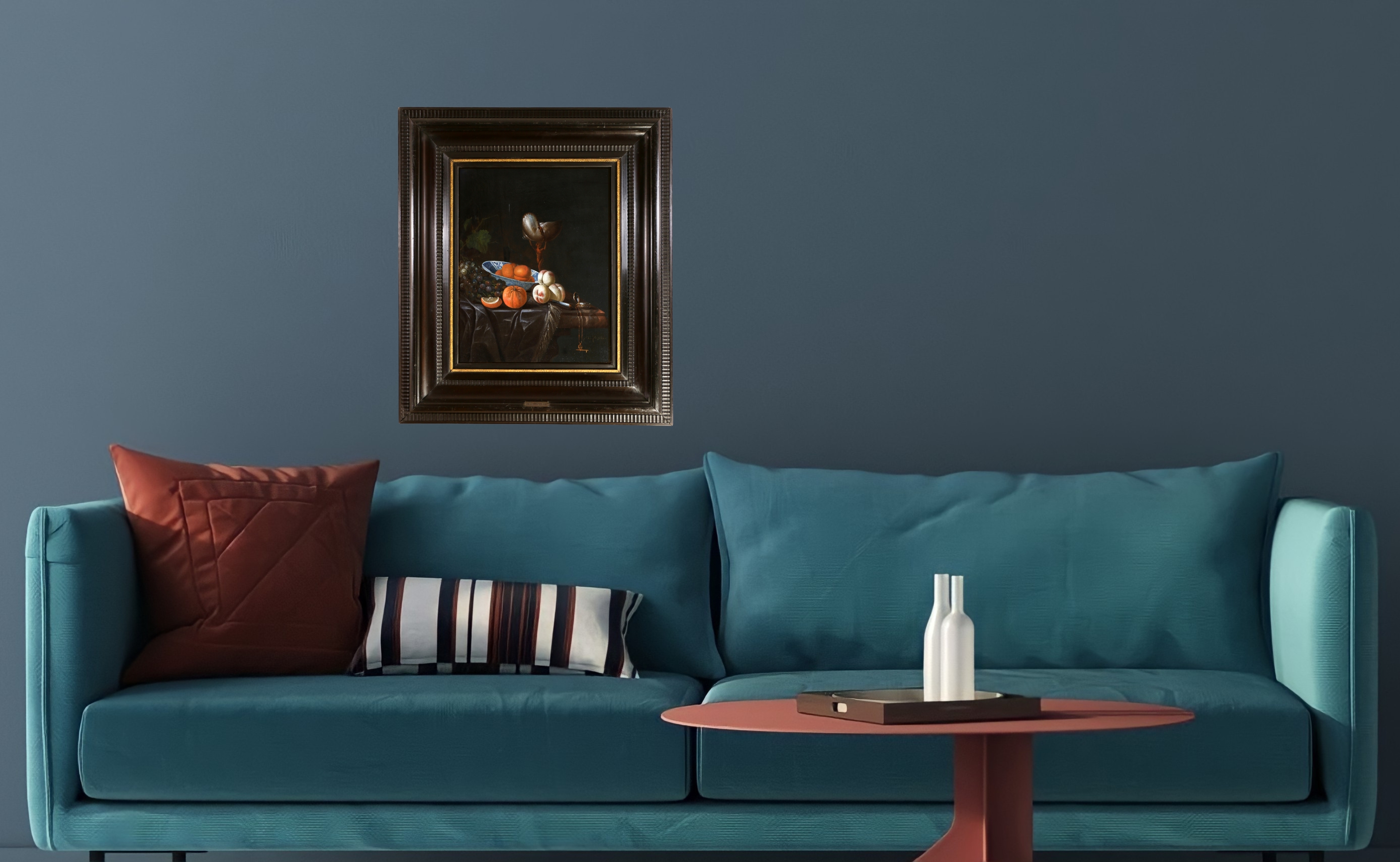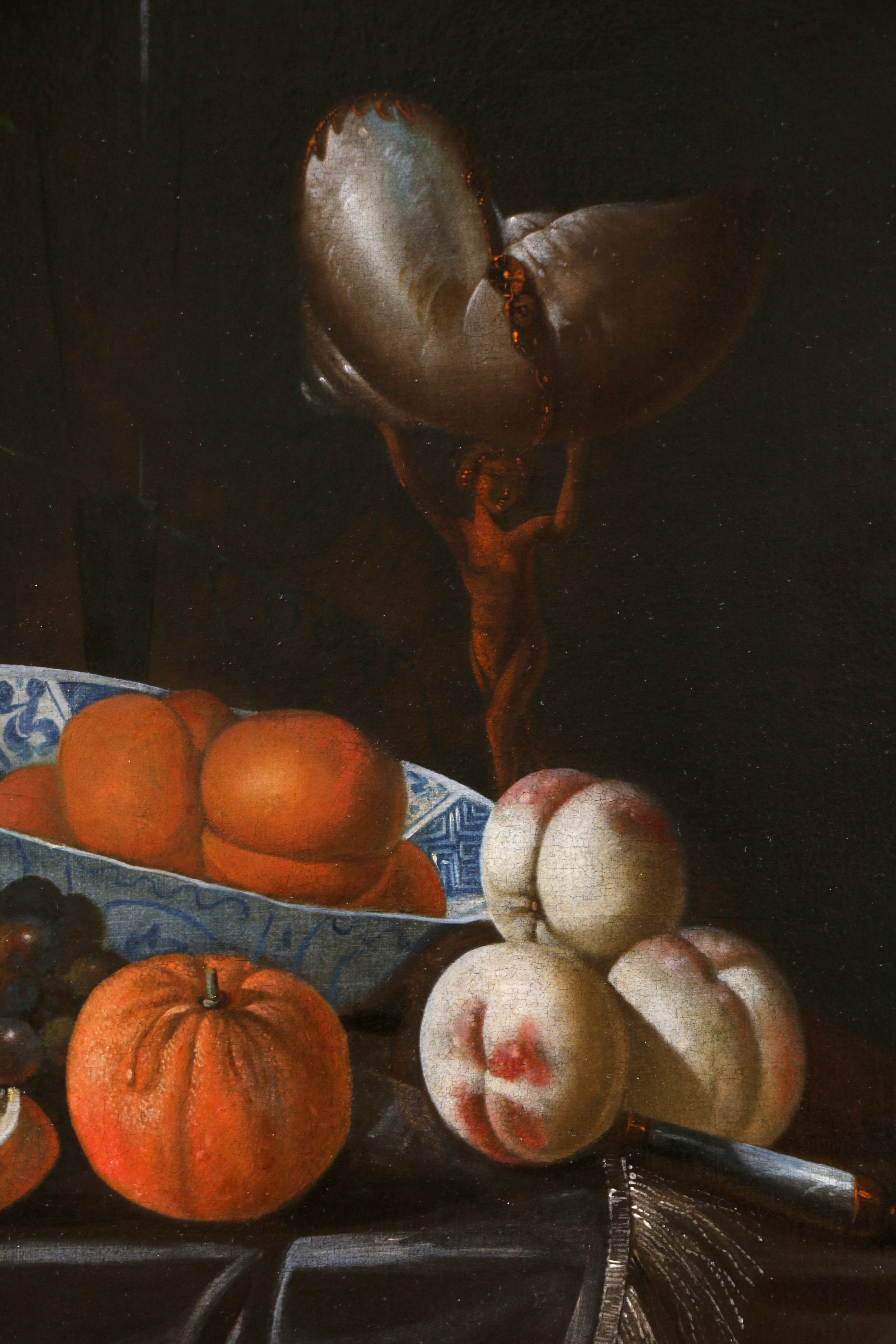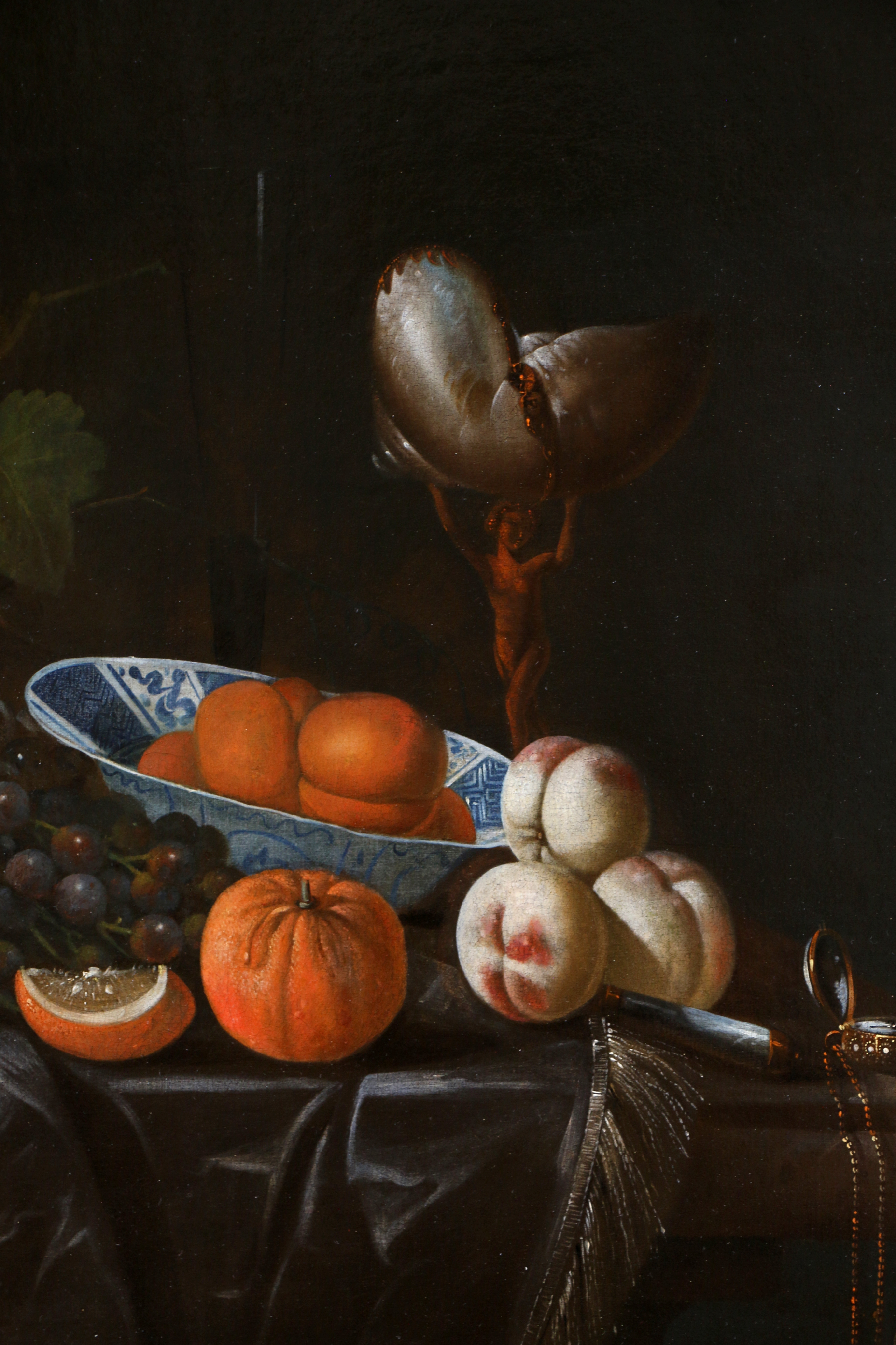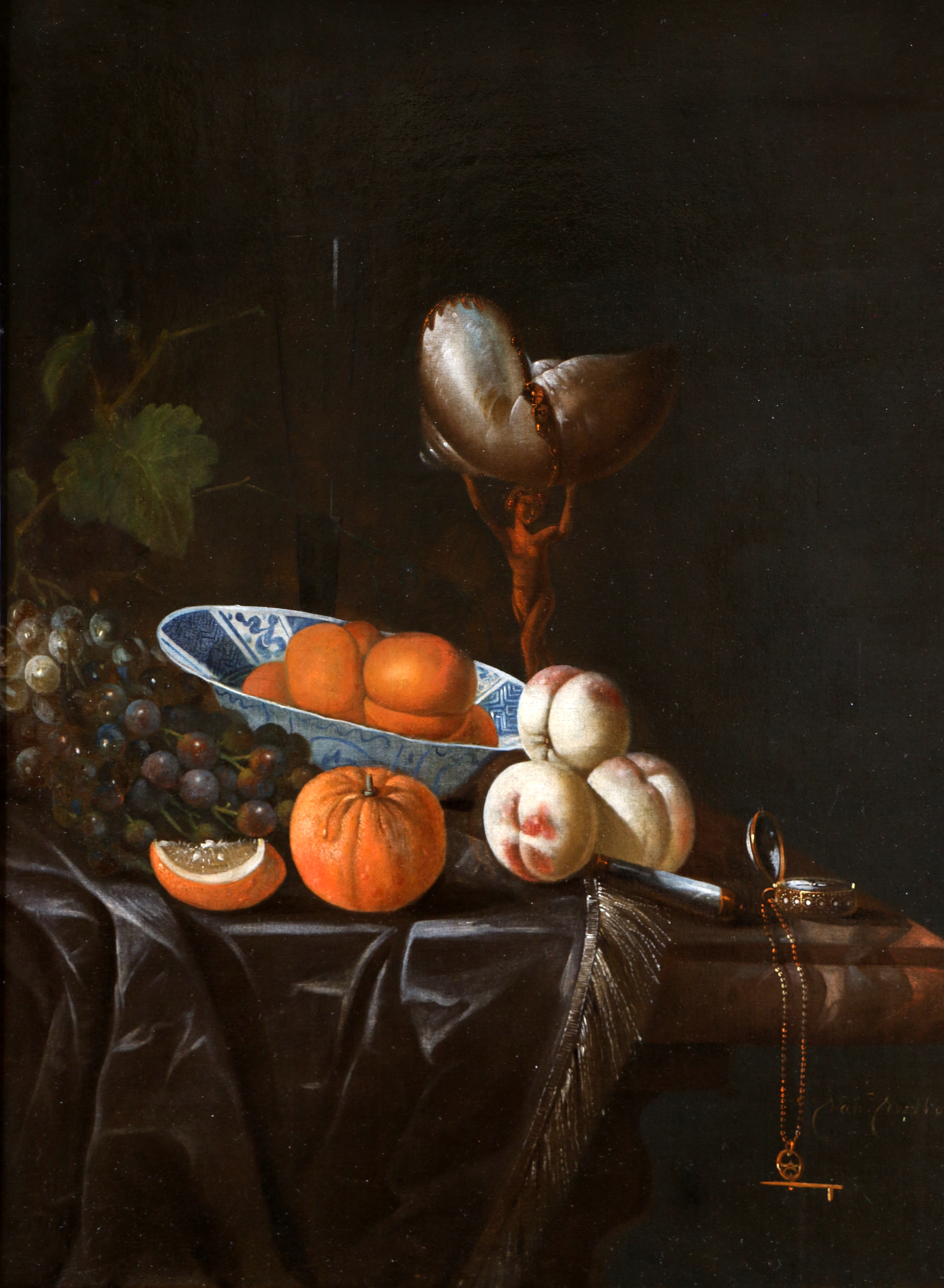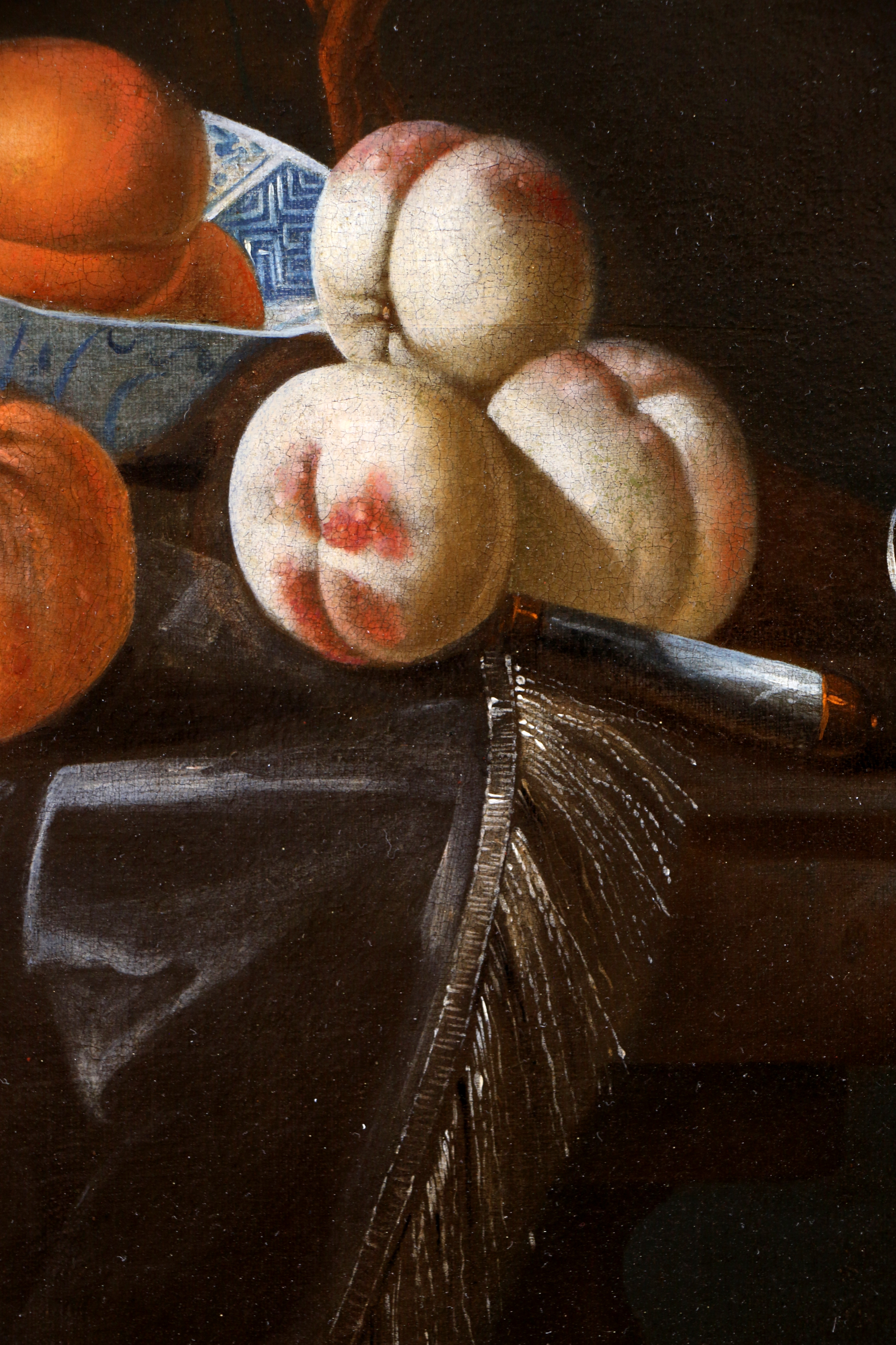 Notre tableau met en scène un raffinement typique de l’art hollandais du Siècle d’or. Sur une table recouverte d’un lourd drapé brun aux reflets satinés, est disposée une composition d’objets précieux et de fruits. Au premier plan, on distingue une orange entière et une orange entamée, quelques pêches blanches marquées de rouge, et une grappe de raisins aux grains translucides. Dans une coupe en porcelaine de Chine à décor bleu, reposent plusieurs mandarines.
