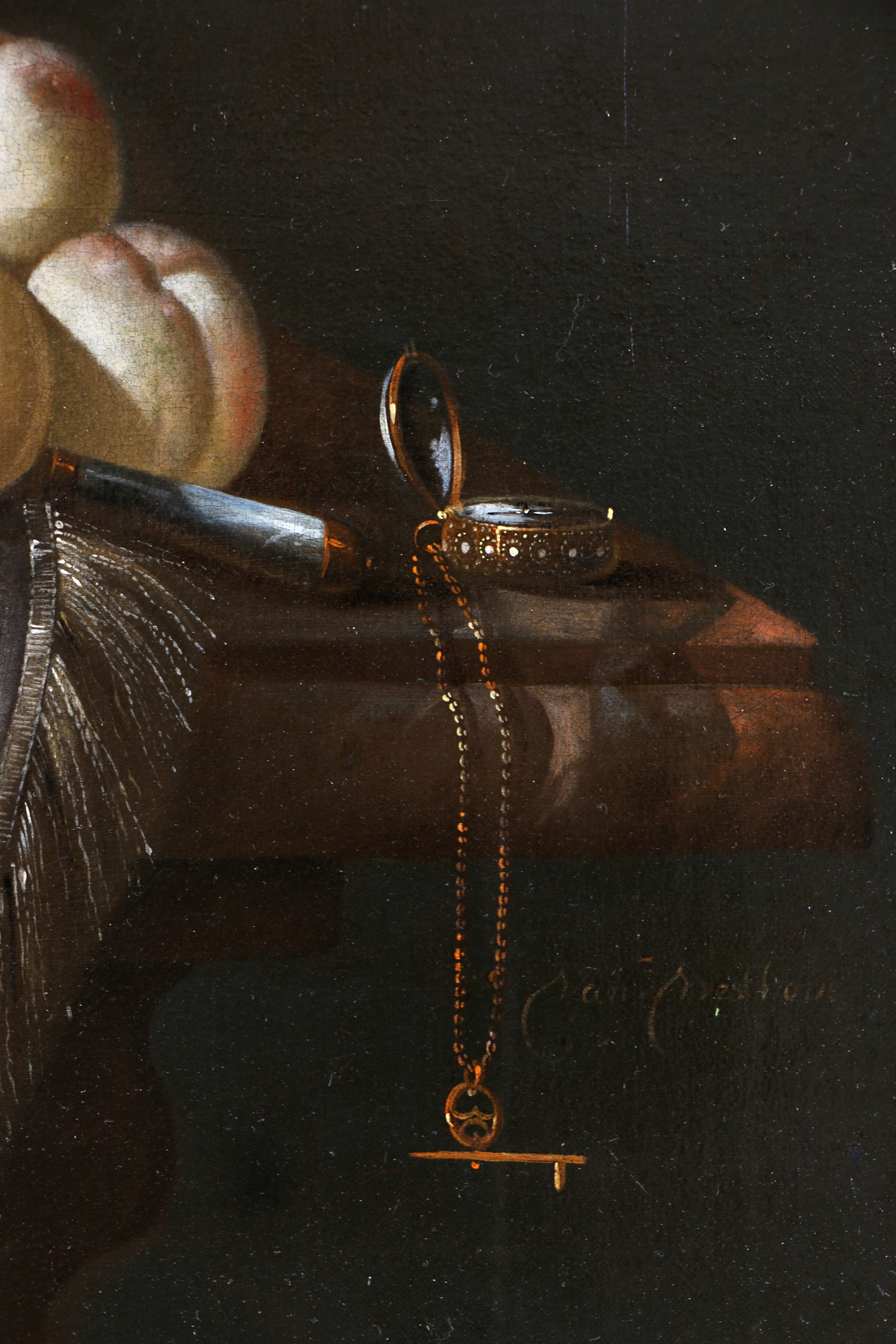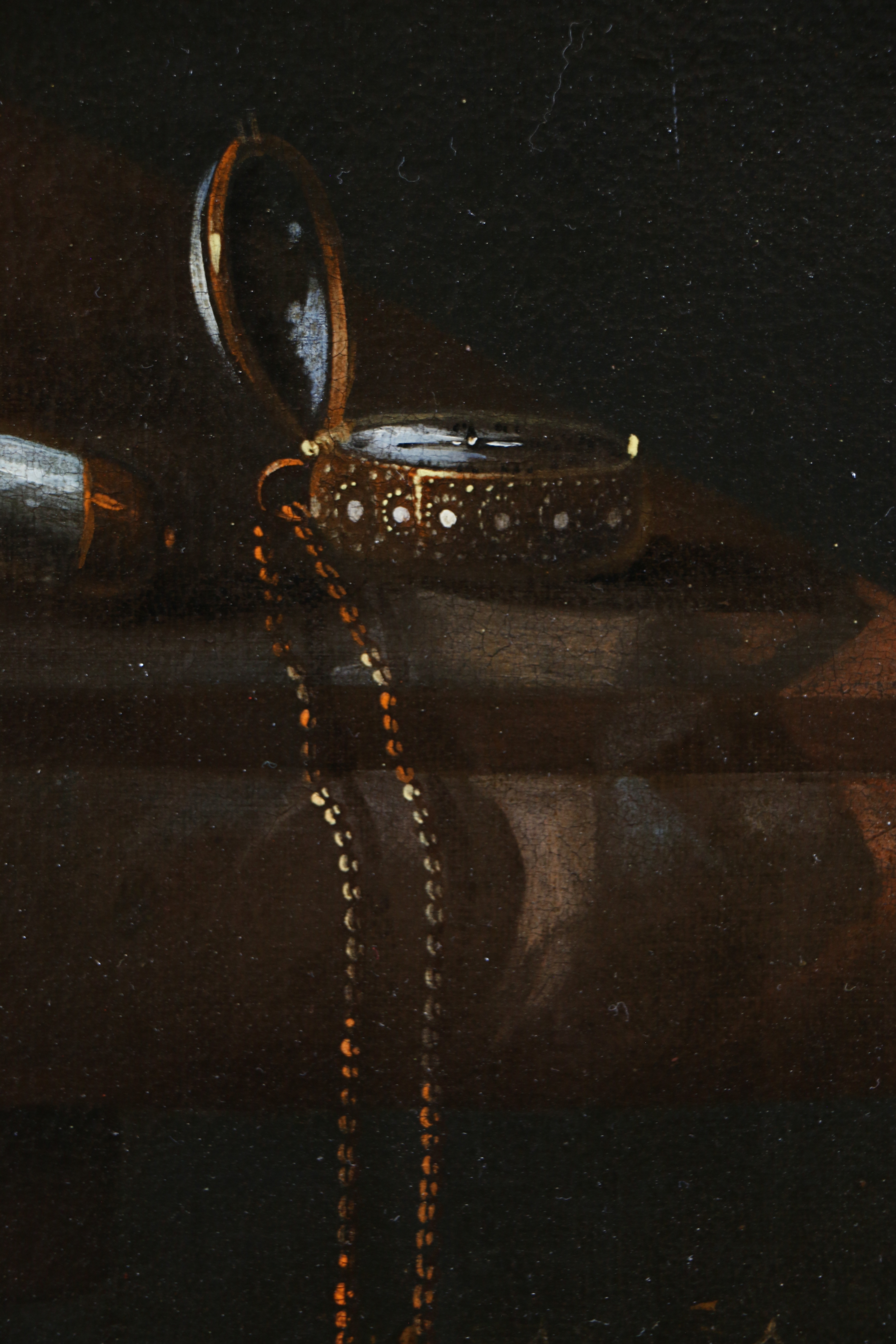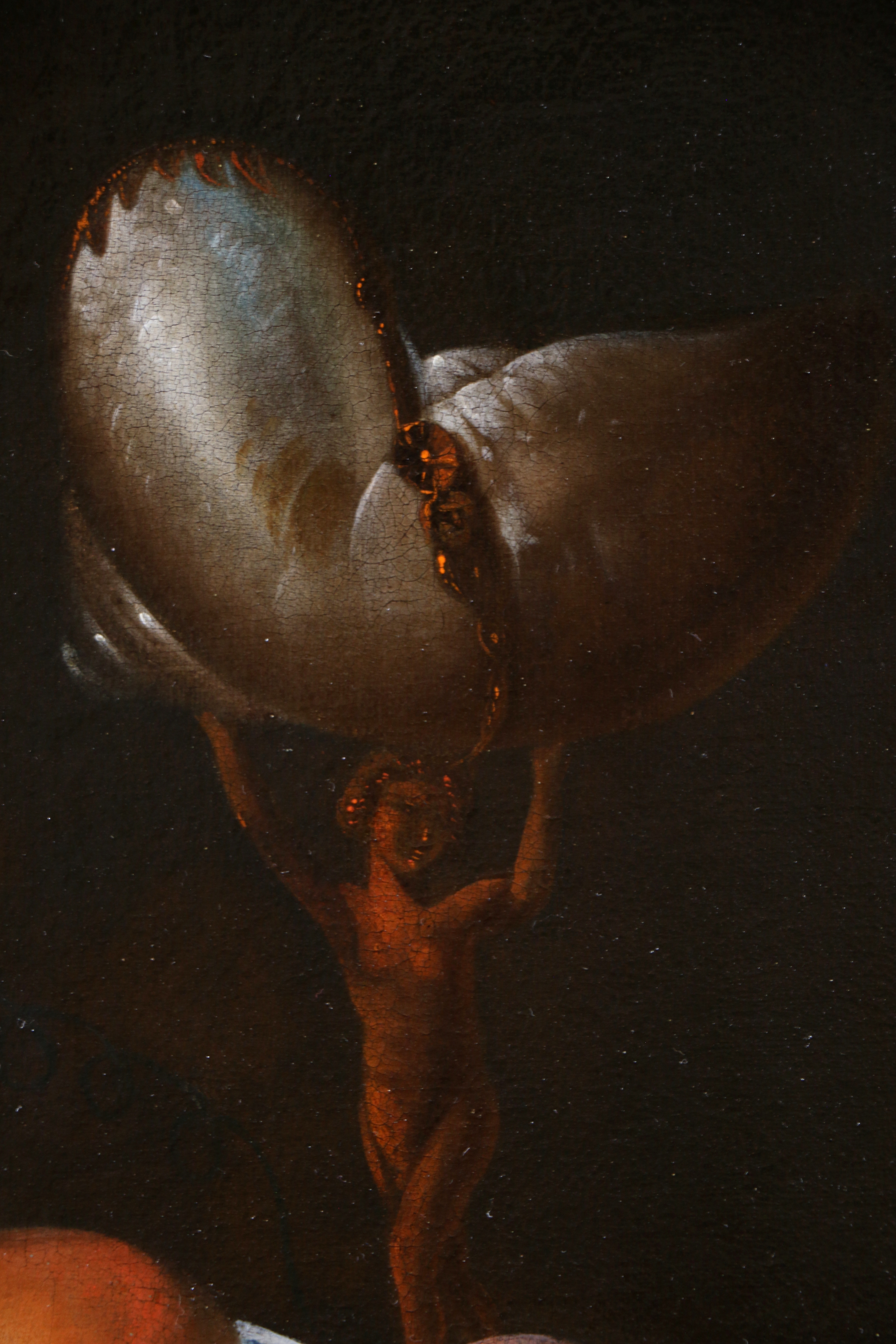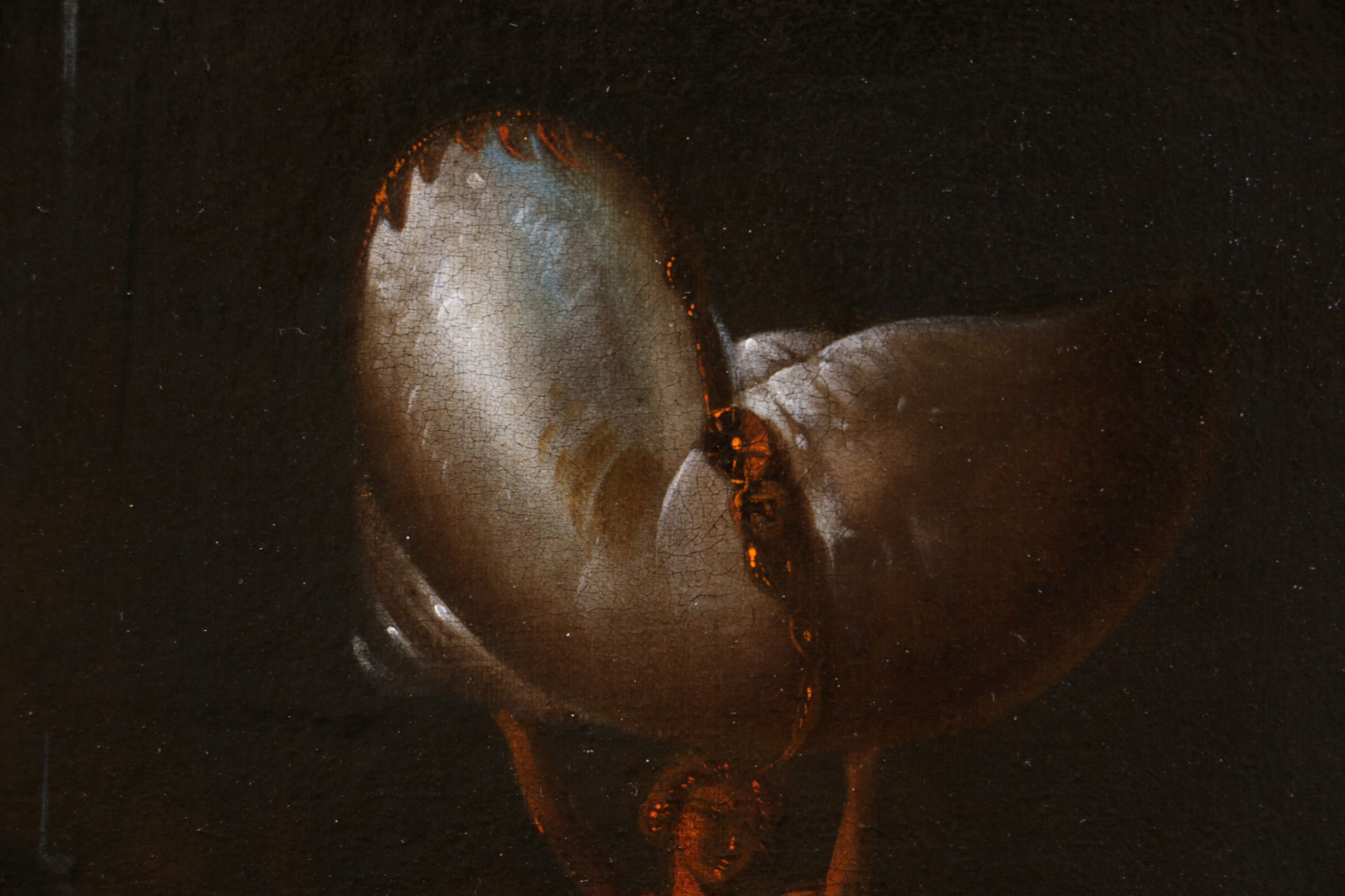 À l’arrière-plan, un grand nautile monté en coupe sur un piédestal qui semble être en corail rouge, orné d’une figurine, témoigne du goût des collectionneurs pour les curiosités naturelles et les objets exotiques. Sur sa gauche, un verre à peine visible où il reste un peu de vin. À droite, sur le rebord de la table, une montre à gousset avec sa chaîne dorée et une clé accentuent la dimension de vanité de la scène, rappelant le passage du temps.