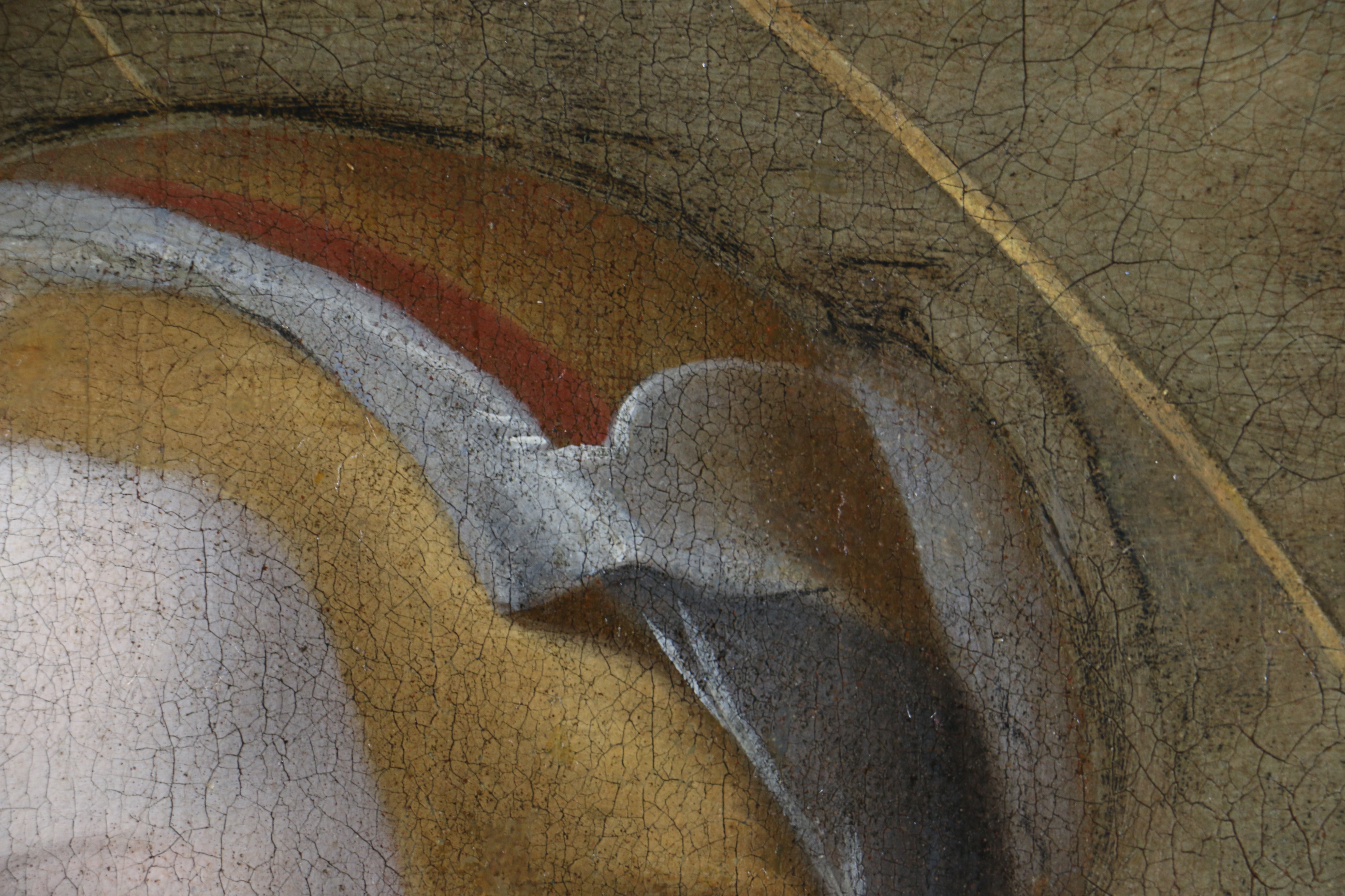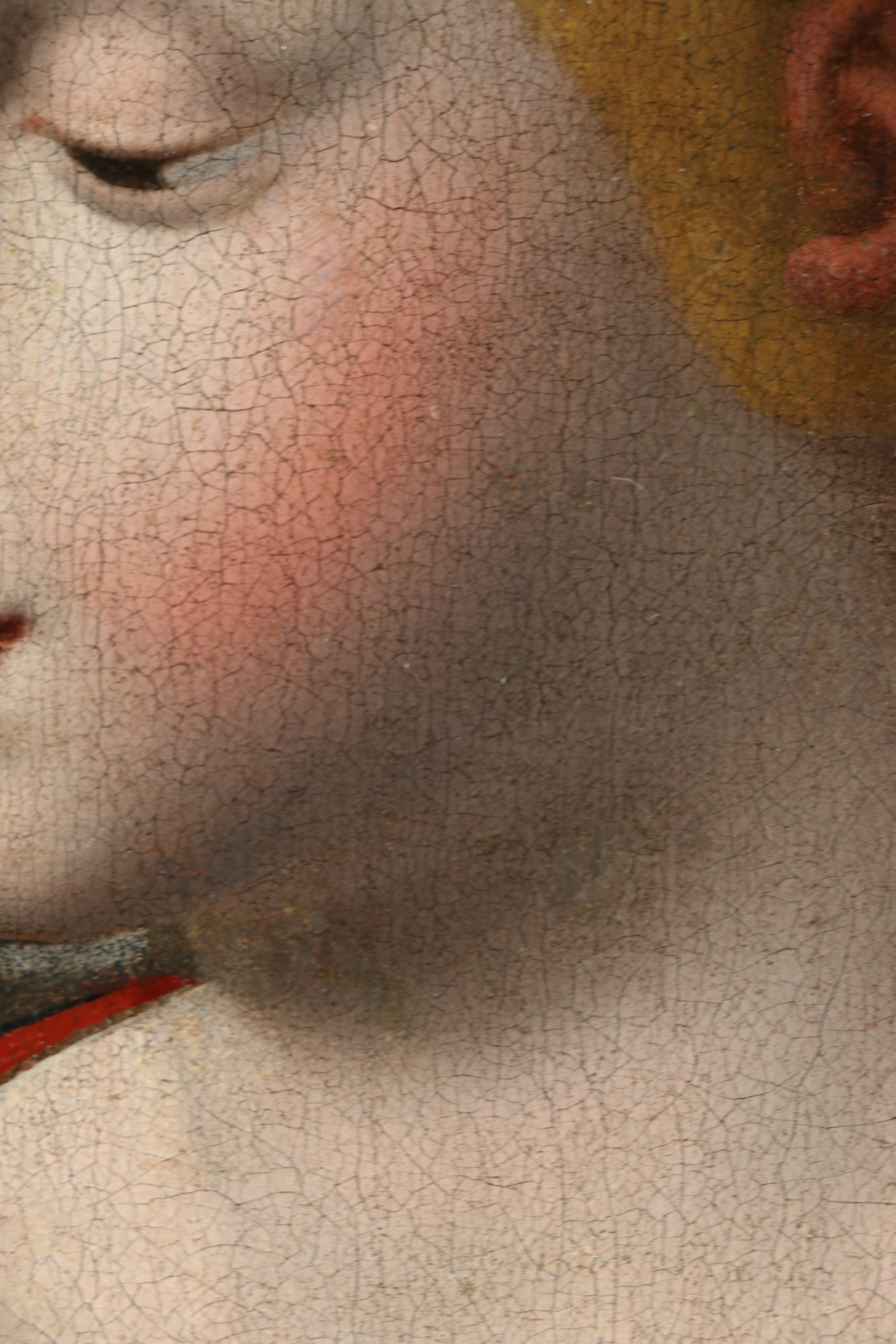 La préparation rouge-brun perceptible en transparence, ainsi que le réseau de craquelures ancien et homogène, cohérent avec la structure de la couche picturale, renforcent l’hypothèse d’une exécution ancienne. L’ensemble de ces éléments situe l’œuvre dans la sphère du classicisme italien, plus précisément dans l’entourage des Carracci et de leurs suiveurs, qui ont largement contribué à la diffusion et à l’interprétation des modèles de Raphaël au XVIIe siècle.