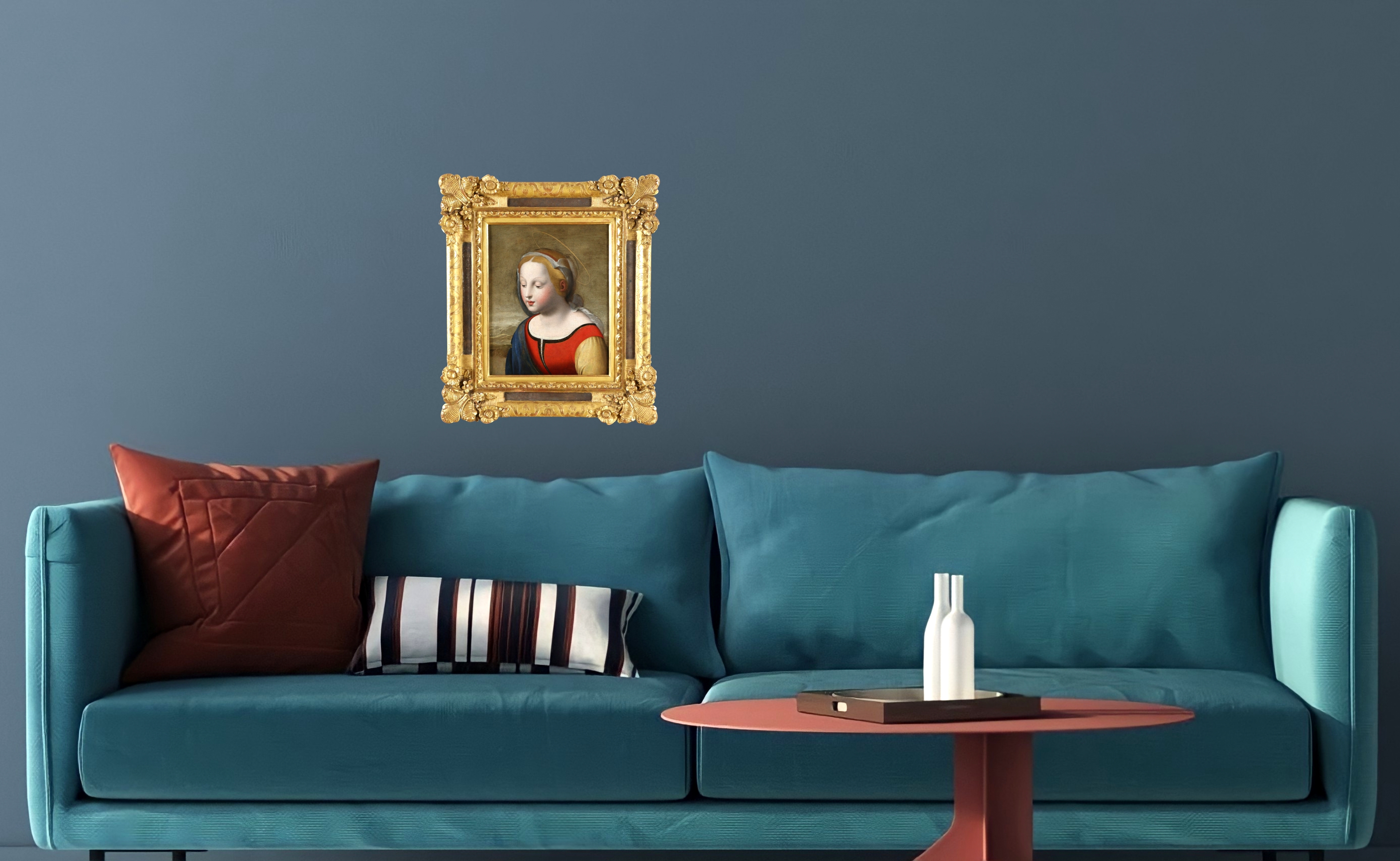 Ce très beau tableau nous propose une reprise de La Belle Jardinière de Raphaël (peinte vers 1507–1508). La Vierge portraiturée à mi-corps, tournée vers la gauche, le regard baissé, dans une attitude empreinte de douceur. Elle est vêtue d’une robe rouge et d’un manteau bleu orné de motifs dorés, avec une manche ocre. Un voile léger encadre la chevelure blonde, tandis qu’un nimbe finement esquissé souligne le caractère sacré de la figure. Le fond présente un paysage traité en plans successifs, dans une gamme de tons harmonisés.